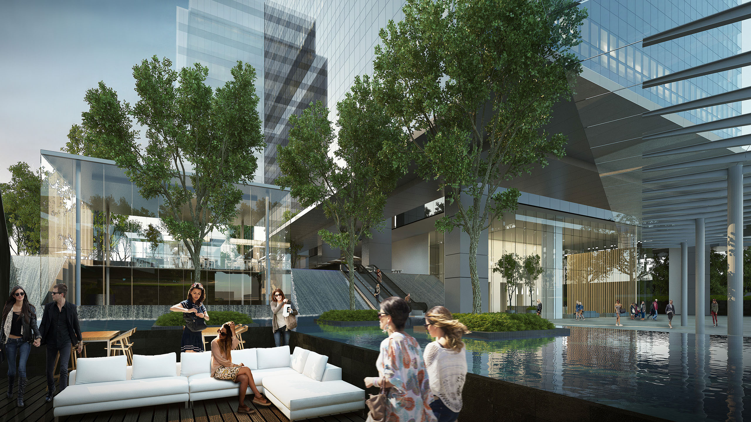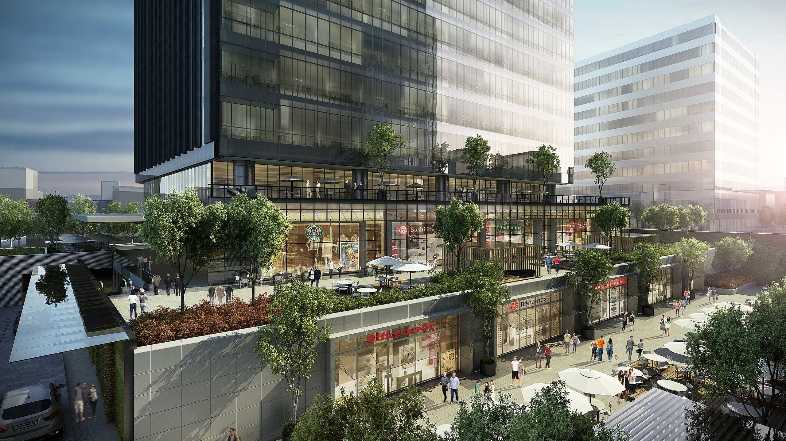 This sober and exceptionally functional glass and steel structure becomes an asset to the upward rising business area of Naucalpan; Containing practical, unassuming yet engaging back office spaces, customer support outlets and business centers. Its structure set in a “main square” scheme that brims with a vast array of restaurants, coffee shops, boutiques, banks and efficient underground parking, taking the mixed usage concept one step further. Its entrance delivers style with its surrounding trees and waterfall fountain that resolves into a pool harmonizing with the glass frames of the principal access.